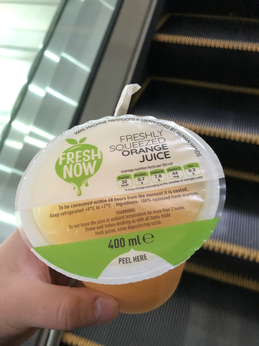 駅に設置してある全自動生絞りオレンジジュースを片手に空港に向かいます。